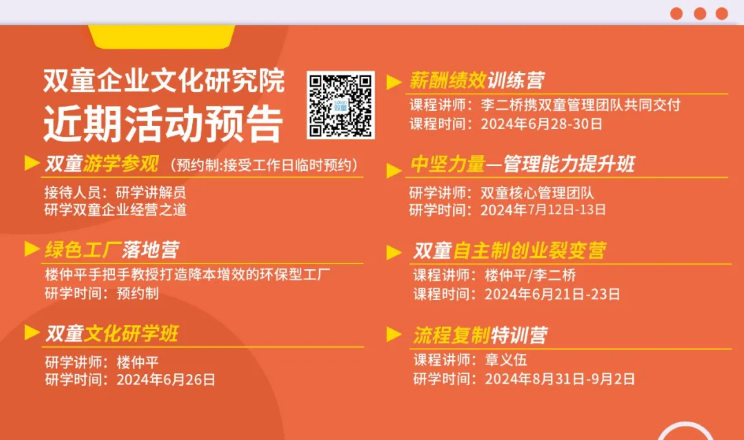如果你也對“雙童”充滿好奇,也想賦能團(tuán)隊(duì)共同成長,歡迎走進(jìn)6月26日【雙童文化研學(xué)班】,與上百位優(yōu)秀的創(chuàng)業(yè)者一起學(xué)習(xí)!少量名額,歡迎咨詢鎖定!