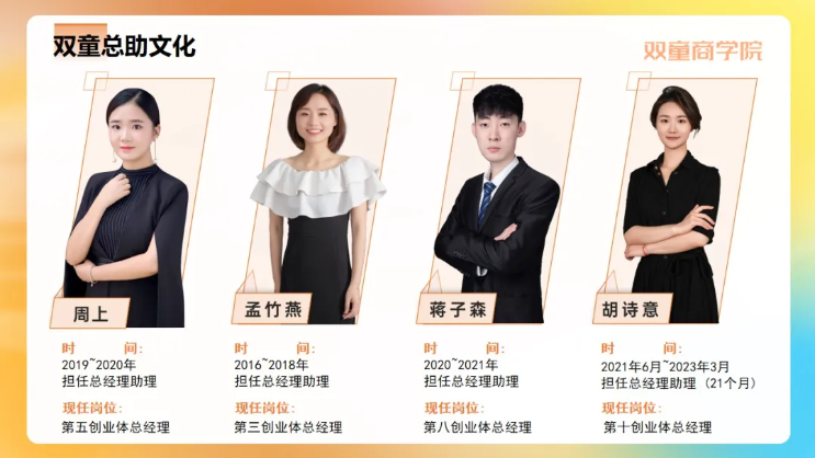 憑借一己之力成為雙童招聘“半壁江山”的蘇紀(jì)林、從基層一線員工成為總經(jīng)理的李二橋、從內(nèi)勤崗位成長(zhǎng)為經(jīng)營體體長(zhǎng)的關(guān)萌萌、在助理文化下完成創(chuàng)業(yè)夢(mèng)想的多位總經(jīng)理……類似的案例,在“雙童”不勝枚舉!