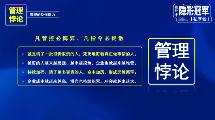 但是根據(jù)管理悖論,“凡管控必博弈,凡指令必耗散”,企業(yè)經(jīng)營真正的危險更多來源于內(nèi)部的耗散;企業(yè)管理真正的成本來源于成員之間的博弈,所以,當(dāng)企業(yè)有一定規(guī)模之后,則要用治理的“疏”替代管理的“堵”,需要在滿足人性訴求下,對管理的本身進(jìn)行結(jié)構(gòu)優(yōu)化和激勵。
