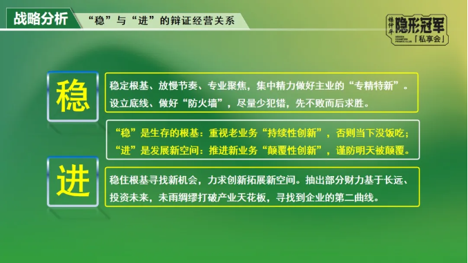 中國社會經(jīng)濟歷經(jīng)幾十年發(fā)展,經(jīng)歷了粗放經(jīng)營的“原始積累”階段,做強做大的“快速發(fā)展”階段。現(xiàn)階段已進(jìn)入到“專精特新”轉(zhuǎn)型和創(chuàng)新階段,真正能挨過一個個經(jīng)濟寒冬并實現(xiàn)基業(yè)長青的企業(yè),一定是極致專注,并在某一細(xì)分領(lǐng)域處于絕對領(lǐng)先地位的隱形冠軍和產(chǎn)業(yè)小巨人。