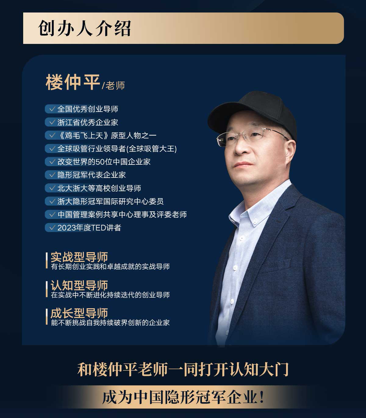 企業(yè)持續(xù)發(fā)展過程中漫長的冠軍之路,需要標(biāo)桿企業(yè)和良師益友的指引與陪伴,而找老師,不要找見識過的老師,而要找建設(shè)過的老師!同時具備實戰(zhàn)型、認(rèn)知型、成長型特質(zhì)的老師是不二選擇,而樓仲平老師恰恰具備了上述各項的所有條件。