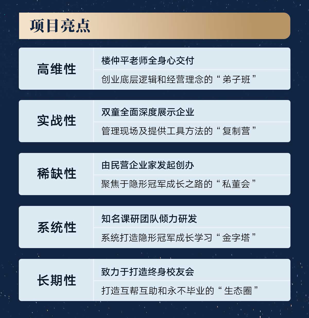 如果你是創(chuàng)業(yè)者、學(xué)習(xí)者、思想者,希望在經(jīng)營領(lǐng)域有自己的思考和洞察,那么《隱形冠軍樓仲平思享薈》就是為你量身定制,今年最后一期招生,一班只招40位同學(xué),名額所剩不多,抓緊機會哦!