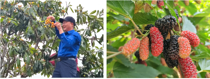 花園的另一角,紫紅的桑葚和金黃的枇杷也交相輝映,枇杷顆顆粒大飽滿,桑葚又像嬌羞的小姑娘,小臉兒的一片,每年春天都“熱鬧”極了!