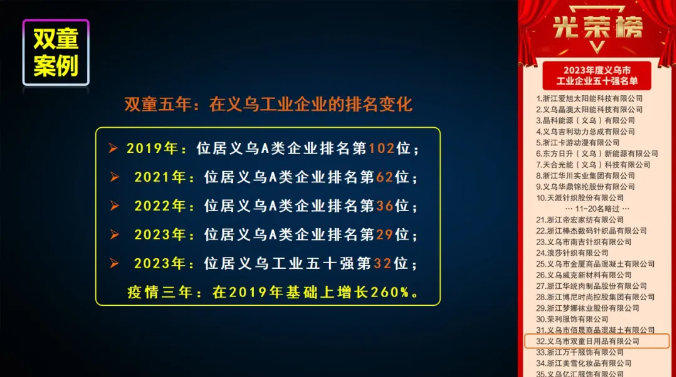 2023年,平臺整體增長35.24%;平臺稅收增長23.30%,成功登榜“納稅千萬元以上工業(yè)企業(yè)”和“義烏市工業(yè)企業(yè)五十強(qiáng)”!