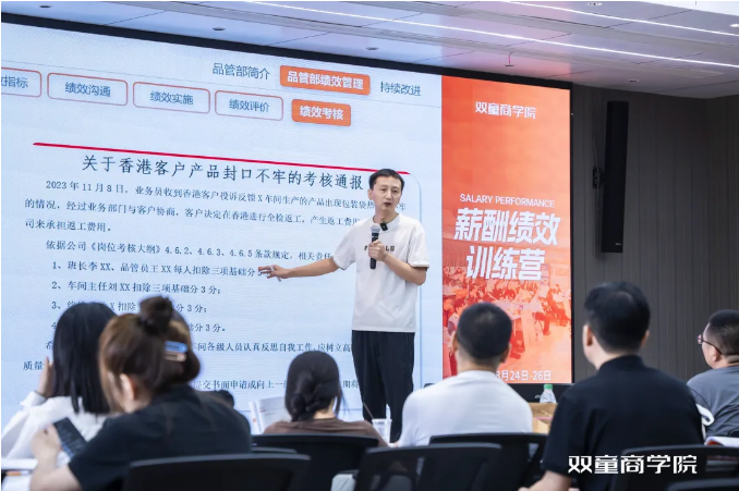 最后一天的課程交付中,會(huì)由作為“雙童”品管部門(mén)的負(fù)責(zé)人陳學(xué)森老師為大家分享部門(mén)案例。陳學(xué)森老師經(jīng)歷了“雙童”品管薪酬績(jī)效構(gòu)成的各個(gè)時(shí)期,所以他在課程中,以自身豐富的實(shí)戰(zhàn)經(jīng)驗(yàn)通過(guò)考核分析、工資框架、梳理指標(biāo)、各崗位指標(biāo)、績(jī)效溝通、績(jī)效實(shí)施、績(jī)效評(píng)價(jià)、績(jī)效考核、客戶(hù)投訴績(jī)效考核等九個(gè)方面,事無(wú)巨細(xì)地向?qū)W員演示薪酬績(jī)效體系在實(shí)操環(huán)節(jié)遇到各種問(wèn)題和解決方案。
