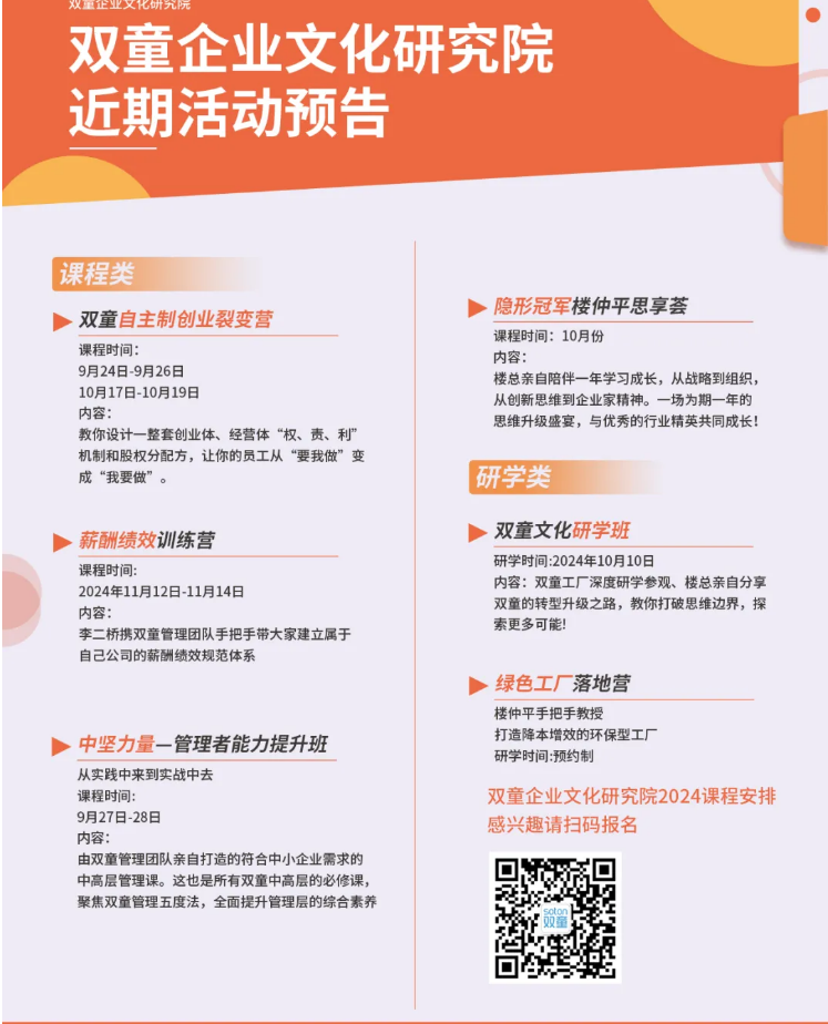 該課程將用一天的時(shí)間,帶領(lǐng)大家實(shí)地探索中國(guó)吸管博物館、“雙童”網(wǎng)紅餐廳、節(jié)能降耗系統(tǒng)、百米文化長(zhǎng)廊、空中生態(tài)花園......除了現(xiàn)場(chǎng)課堂,還有創(chuàng)始人樓仲平3個(gè)小時(shí)的主題課程分享,讓學(xué)員親身感受“雙童”的經(jīng)營(yíng)哲學(xué)!