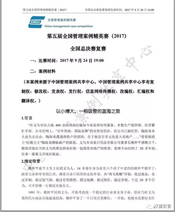 其中浙江工業(yè)大學(xué)和南京大學(xué)采編的管理案例分別被評為2016年和2017年度全國管理案例的百優(yōu)案例。在2017年全國管理案例精英賽中,《以小博大,一根吸管的藍(lán)海之旅》被指定為總決賽的PK案例。截至目前,以“雙童”為主題的案例進(jìn)入到國家案例庫的數(shù)量就有十多件。