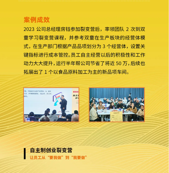 而《自主制創(chuàng)業(yè)裂變營(yíng)》就是依托該機(jī)制,把“雙童”的落地實(shí)操方法與成功經(jīng)驗(yàn)經(jīng)驗(yàn)有機(jī)結(jié)合,不斷打磨、升級(jí)的一套針對(duì)中小微企業(yè)的管理課程。