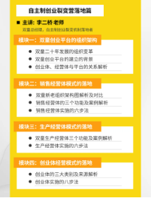 落地實(shí)操篇則由雙童總經(jīng)理李二橋進(jìn)行交付!作為裂變機(jī)制的執(zhí)行者,他以雙童內(nèi)部對(duì)裂變機(jī)制的實(shí)際運(yùn)行狀況為案例教材,將課程分為五大模塊,16個(gè)小節(jié),盡可能最詳細(xì)、最全面地交付給學(xué)員操作方法!