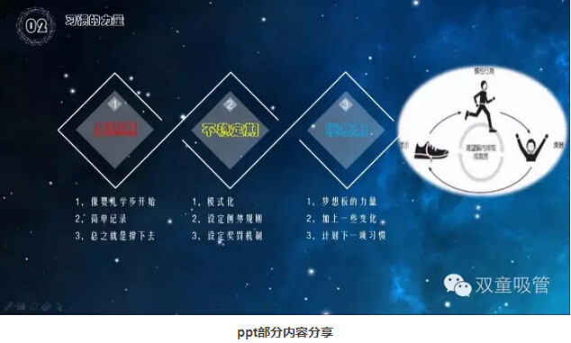 第二個(gè)關(guān)鍵詞就是我們的習(xí)慣啦!你們有試過21天養(yǎng)成一個(gè)習(xí)慣嗎?一聽到這個(gè)問題,童鞋們也分享起了自己的經(jīng)歷。有的已經(jīng)形成了習(xí)慣,有的只堅(jiān)持了幾天就放棄了。其實(shí)習(xí)慣的養(yǎng)成都會(huì)經(jīng)歷三個(gè)階段:反抗期、不穩(wěn)定期、倦怠期。如何度過這三個(gè)階段養(yǎng)成習(xí)慣呢?妞就把干貨PPT放上來與大伙共享吧!