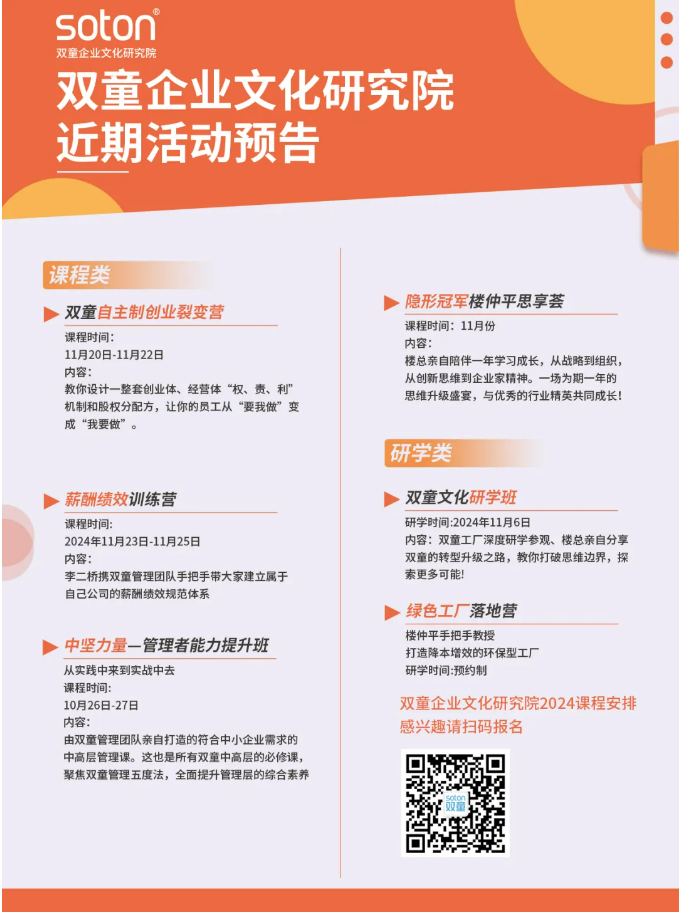 一旦把這個(gè)杠桿撬動(dòng)之后,員工自然從原來的“要我做”,變成了現(xiàn)在的“我要做”,也打開了企業(yè)的天花板。從2018年之后,雙童短短六年時(shí)間,裂變出了四十多個(gè)板塊,也就是四十多個(gè)員工跟著我共同創(chuàng)業(yè),做出了40多個(gè)增量板塊,然后我把增量的40%、50%給他們,因?yàn)槭菃T工自己創(chuàng)造的,員工獲得的多了,這些真正優(yōu)秀的員工也留下來了,成為雙童的生產(chǎn)力。通過裂變機(jī)制,40多位員工不僅薪資倍數(shù)增長
