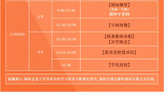《創(chuàng)業(yè)者成長》作為樓仲平弟子班的啟動模塊,將用時4天3晚完成交付,旨在深度挖掘“雙童”近30年的成長歷程背后創(chuàng)始人樓仲平的成長方式,從而樓老師的思維與認知遷移到學員自身的成長和所在企業(yè)的成長上。