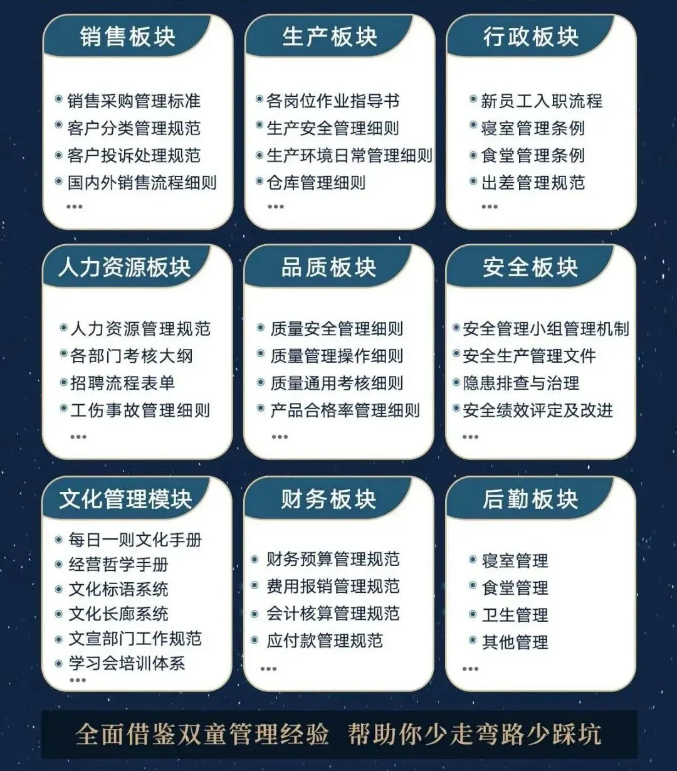 所以,入學“隱形冠軍樓仲平思享薈”之后,項目組會將“雙童”積累了30年、包含了銷售、生產(chǎn)、行政、人類資源、品質(zhì)、安全、文化管理、財務(wù)和后勤等9大板塊,近600份管理規(guī)范文件,全部打包給學員,幫助學員企業(yè)能夠全面借鑒雙童管理經(jīng)驗、少走彎路、少踩坑!