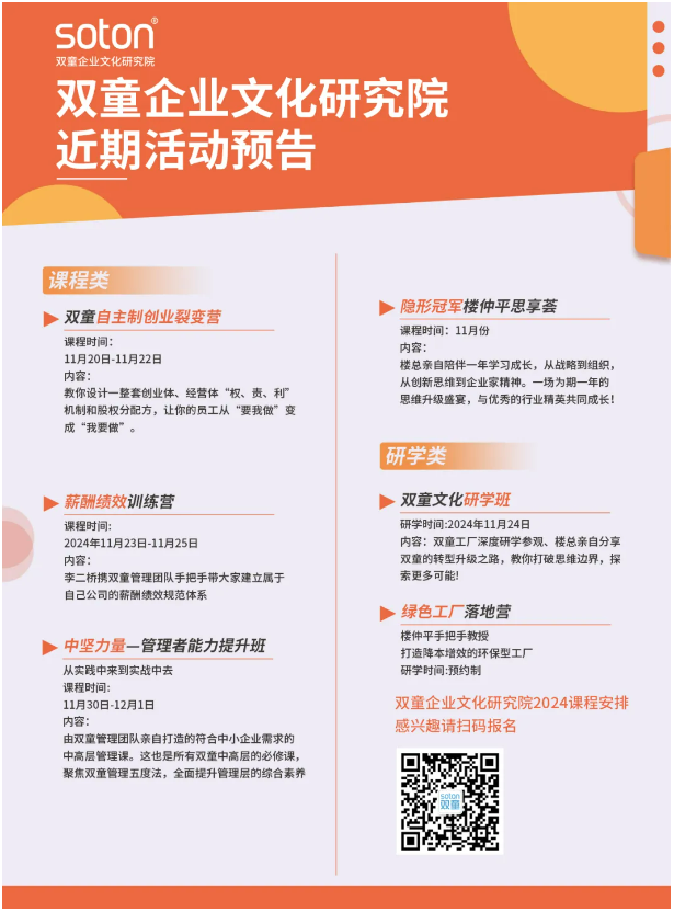 如果你也對(duì)“雙童”充滿好奇,也想賦能團(tuán)隊(duì)共同成長(zhǎng),歡迎走進(jìn)11月24日【雙童文化研學(xué)班】,與上百位優(yōu)秀的創(chuàng)業(yè)者一起學(xué)習(xí)!