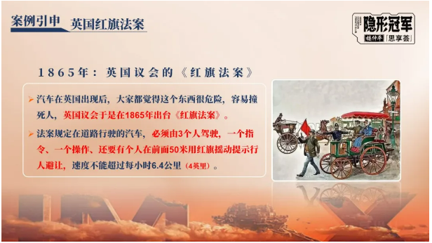 為了讓同學(xué)們更好理解為什么經(jīng)驗(yàn)具有時(shí)效性,樓老師在課程中引申了經(jīng)典的英國(guó)《紅旗法案》案例:英國(guó)人按照延續(xù)幾千年的馬車經(jīng)驗(yàn)來(lái)制定汽車的行路規(guī)范,導(dǎo)致英國(guó)汽車產(chǎn)業(yè)被抑制,從而被美國(guó)后來(lái)居上。