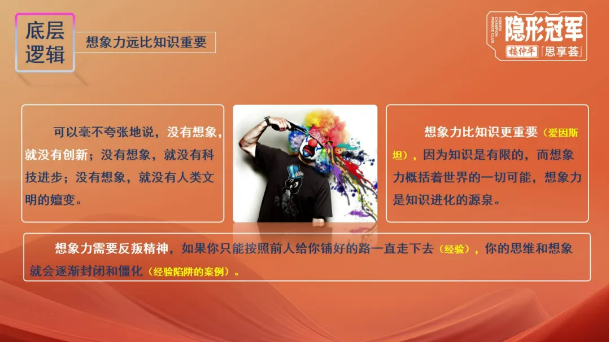 為了提高同學(xué)們對(duì)想象力的重視,該章節(jié)一開始,樓老師就借用視頻“愛因斯坦的忠告”讓大家明白:想象力比知識(shí)更重要,因?yàn)橹R(shí)是有限的,而想象力則包圍著整個(gè)世界。