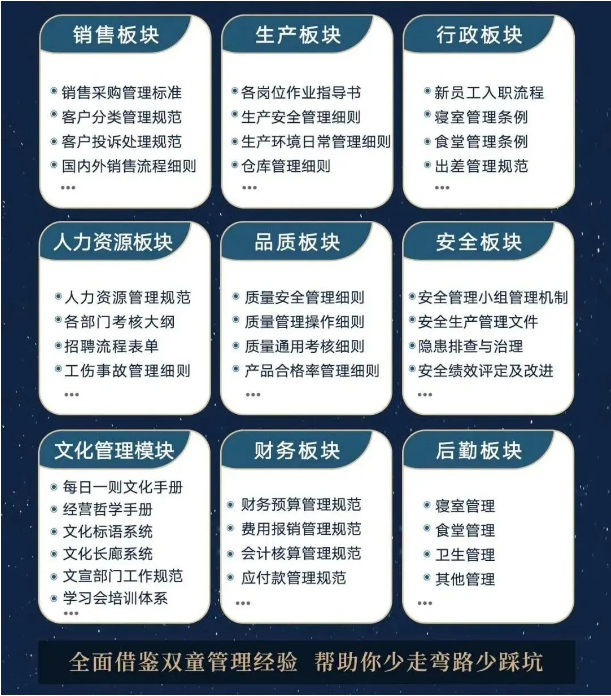 所以,入學(xué)“隱形冠軍樓仲平思享薈”之后,項(xiàng)目組會(huì)將“雙童”積累了30年、包含了銷售、生產(chǎn)、行政、人類資源、品質(zhì)、安全、文化管理、財(cái)務(wù)和后勤等9大板塊,近600份管理規(guī)范文件,全部打包給學(xué)員,幫助學(xué)員企業(yè)能夠全面借鑒雙童管理經(jīng)驗(yàn)、少走彎路、少踩坑!