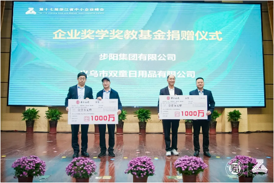 本次峰會還舉行了企業(yè)獎學獎教基金捐贈儀式。其中,義烏市雙童日用品有限公司設立基金增至1000萬元,旨在為浙江師范大學行知學院的教育發(fā)展貢獻一份力量,助力其教育事業(yè)更上一層樓。