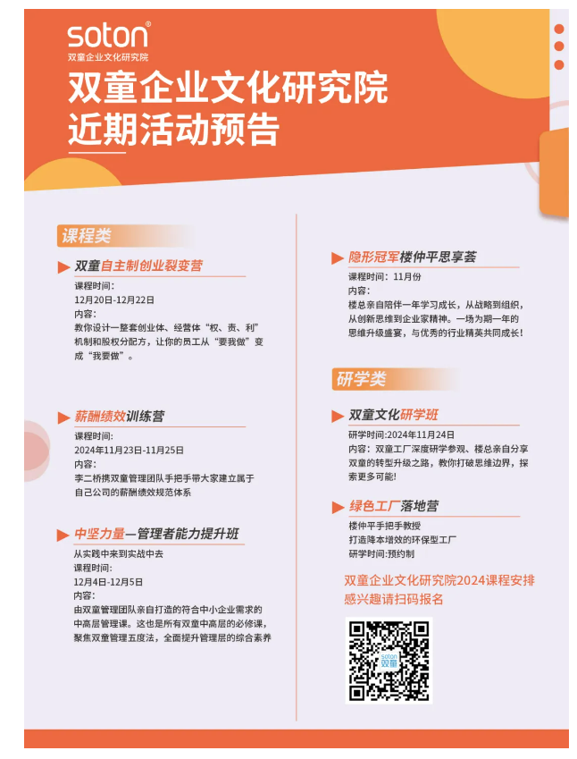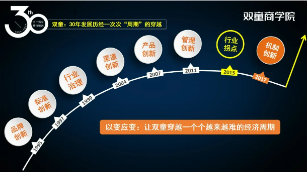 首先雙童經過30年的發(fā)展,經歷了粗放經營的“原始積累”階段,做強做大的“快速發(fā)展”階段、“專精特新”轉型和創(chuàng)新階段,深知中小企業(yè)各個階段的痛點,還是首個“彼得·德魯克中國管理獎”的中小企業(yè)獲得者,雙童的經營理念和管理體系能夠幫助更多中小企業(yè)少走彎路、少踩坑!