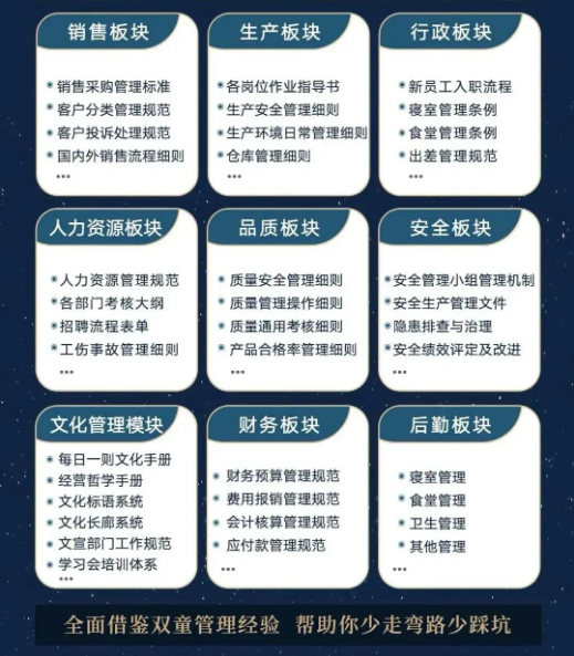 所以,入學(xué)“隱形冠軍樓仲平思享薈”之后,項(xiàng)目組會(huì)將“雙童”積累了30年、包含了銷售、生產(chǎn)、行政、人類資源、品質(zhì)、安全、文化管理、財(cái)務(wù)和后勤等9大板塊,近600份管理規(guī)范文件,全部打包給學(xué)員,幫助學(xué)員企業(yè)能夠全面借鑒雙童管理經(jīng)驗(yàn)、少走彎路、少踩坑!