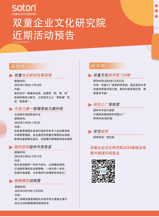 當(dāng)時確實是面臨企業(yè)生存的問題,需要開辟“第二曲線”。最初并沒有計劃要做商學(xué)院,甚至在接受邀請時我都拒絕了。疫情期間,雙童平臺孵化了十幾個員工創(chuàng)業(yè)項目。那時,一位小姑娘看到同事們紛紛開始創(chuàng)業(yè),她也產(chǎn)生了創(chuàng)業(yè)的想法。她來找我時提到,既然我能到這么多大學(xué)去講課,為什么我們不能自己開設(shè)一個學(xué)習(xí)中心?經(jīng)過一番思考,我決定開設(shè)學(xué)習(xí)中心,最終發(fā)展成了今天的雙童商學(xué)院。