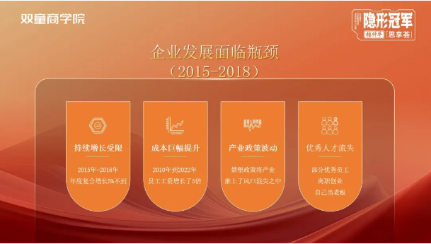 2015-2018年,雙童的發(fā)展進(jìn)入了瓶頸期:持續(xù)增長受限,成本大幅度提升,產(chǎn)業(yè)政策造成了很大波動(dòng),優(yōu)秀人才的也開始流失。這些都是亟待解決的難題。