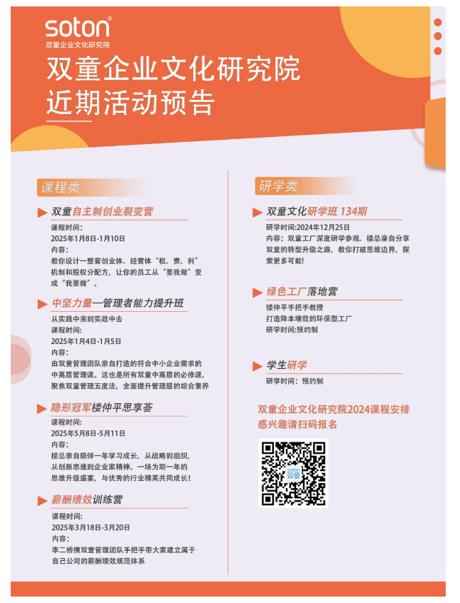如果你也對“雙童”充滿好奇,也想賦能團(tuán)隊共同成長,歡迎走進(jìn)12月25日走進(jìn)第134期【雙童文化研學(xué)班】,與上百位優(yōu)秀的創(chuàng)業(yè)者一起學(xué)習(xí)!