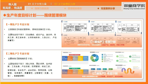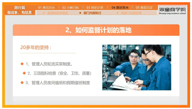 考慮到目標(biāo)分解中可能會遇到的問題,如員工不配合,目標(biāo)分配不公平,李二橋老師也根據(jù)雙童的案例,給出相應(yīng)的解決方案。 ③ 制定計(jì)劃 一個好的計(jì)劃 ,勝過一百次的盲目行動。 雙童“自下而上”制定計(jì)劃的方式,為學(xué)員們提供了很好的范本: