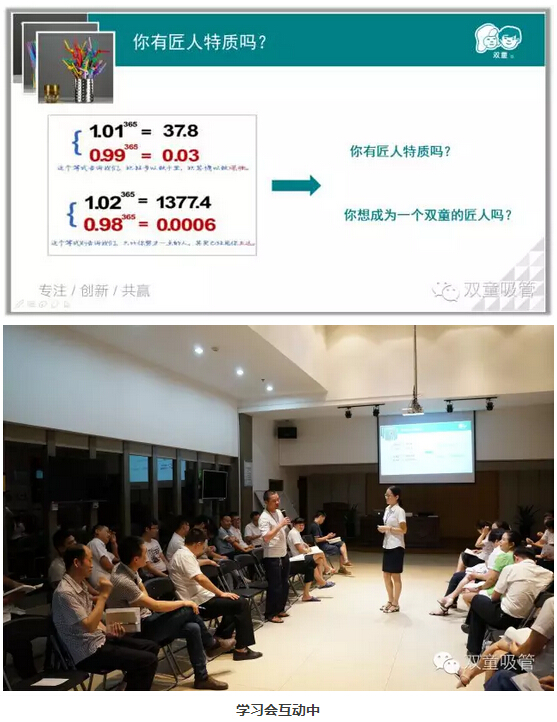“你有匠人特質(zhì)嗎?”接下來吸管妹妹和大家做了個很有意思的互動,1.01的365倍是37.8,1.02的365倍是1377.4,反之,少了0.01,365天之后,你就比別人少了很多??梢?,一天兩天的改變或許看不出什么,但是每天都努力一點(diǎn)點(diǎn),每天都進(jìn)步一點(diǎn)點(diǎn),發(fā)生的變化將是巨大的!