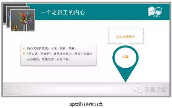 學(xué)習(xí)會進(jìn)行到最后,我們的李總也上臺發(fā)言了。他說,這本教材書籍其實(shí)是當(dāng)家人樓總和幾位主要的高層領(lǐng)導(dǎo)全部看過這本書后,覺得這本書相當(dāng)契合我們雙童的企業(yè)文化,決定送給每個員工一本!也希望大家可以提前預(yù)習(xí),以后多多上臺發(fā)表讀后感!哈哈,放心吧,吸管妞今天晚上就看!