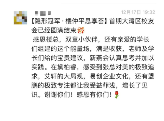“弟子班”永不畢業(yè),持續(xù)成長(zhǎng)!12月15-16日,隱形冠軍樓仲平思享薈舉行首期大灣區(qū)校友會(huì)研學(xué)專場(chǎng)。此次活動(dòng)不僅是第一期至第三期弟子班同學(xué)的首次薈聚,更是一場(chǎng)思維碰撞與智慧交融的盛宴。很多學(xué)員都期盼已久!