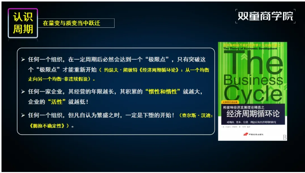 在中小企業(yè)平均壽命不到三年的情況下,企業(yè)正面臨著越來(lái)越難的經(jīng)濟(jì)周期,如何讓企業(yè)持續(xù)保持足夠的“活性”和“活力”, 需要?jiǎng)?chuàng)業(yè)者擁有強(qiáng)烈的經(jīng)營(yíng)“周期意識(shí)”,只有認(rèn)識(shí)周期,才能防范周期,進(jìn)而帶領(lǐng)企業(yè)穿越周期!