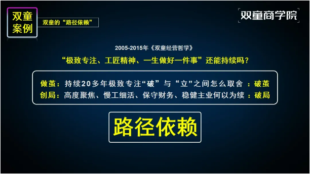 2015年,雙童發(fā)展正如日中天,但創(chuàng)始人樓仲平已經(jīng)隱隱意識(shí)到雙童已經(jīng)來(lái)到了新的極限點(diǎn)。樓老師還現(xiàn)場(chǎng)播放了一段大約十年前央視《新聞聯(lián)播》報(bào)道雙童的視頻,向大家展示了雙童在吸管行業(yè)的領(lǐng)先地位。但也就是在這段時(shí)期,雙童遇到了行業(yè)“天花板”,創(chuàng)新紅利已經(jīng)開始衰竭,國(guó)際禁塑也讓吸管的應(yīng)用場(chǎng)景在大幅減小,行業(yè)越來(lái)越內(nèi)卷!《雙童經(jīng)營(yíng)哲學(xué)》(2015版)中倡導(dǎo)的“極致專注、工匠精神、一生做好一件事”不可持續(xù)!