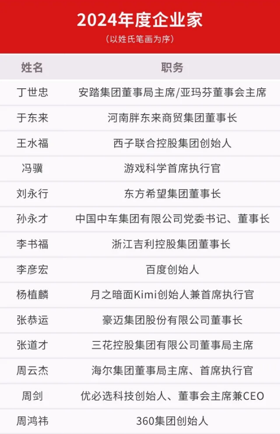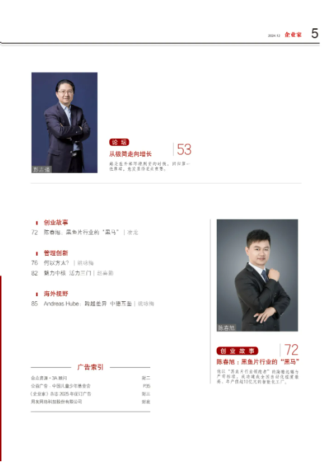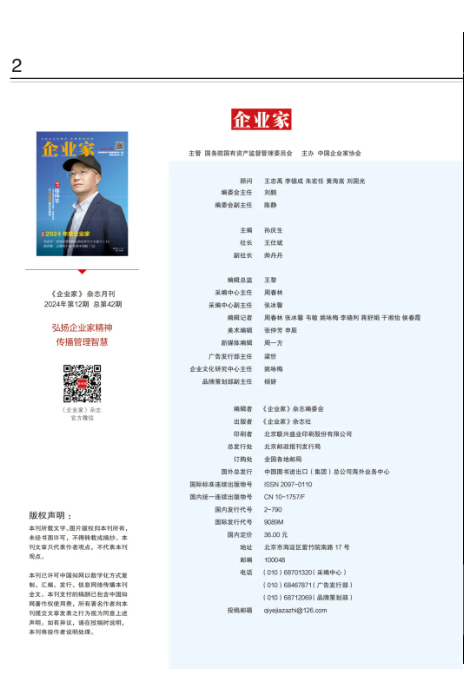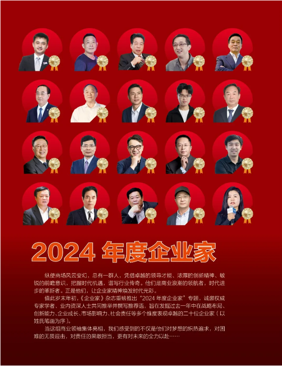 值此歲末年初,《企業(yè)家》雜志重磅推出“2024年度企業(yè)家”專題,誠邀權威專家學者、業(yè)內資深人士共同推舉并撰寫推薦語,旨在發(fā)掘過去一年中在戰(zhàn)略布局、創(chuàng)新能力、企業(yè)成長、市場影響力、社會責任等多個維度表現(xiàn)卓越的二十位企業(yè)家(以姓氏筆畫為序)。