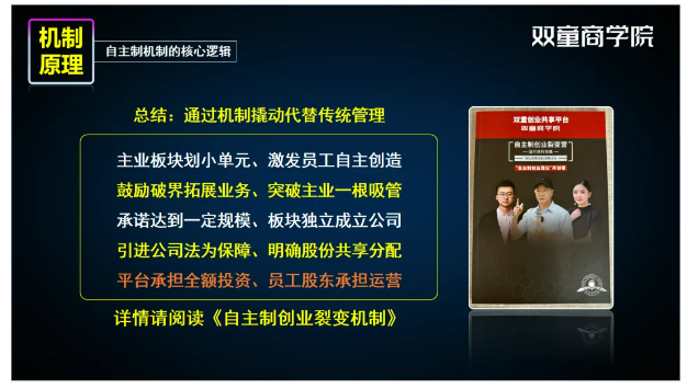 為了助力更多中小企業(yè)也能運(yùn)用這套機(jī)制實(shí)現(xiàn)快速增長,早在2022年,雙童商學(xué)院就針對該機(jī)制打磨成《自主創(chuàng)業(yè)裂變營》課程。