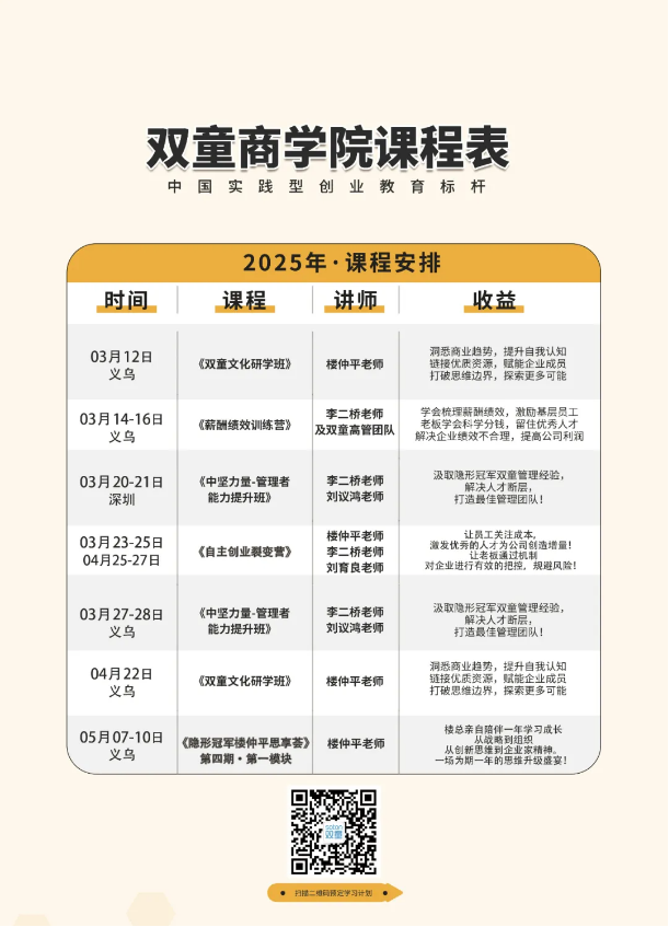 如果你也對“雙童”充滿好奇,也想全面了解“雙童”的企業(yè)文化、經(jīng)營理念、精細(xì)化管理,通過系統(tǒng)的課程深入地探索、學(xué)習(xí)“雙童”成為行業(yè)“隱形冠軍”的底層邏輯,從而賦能自己的企業(yè),歡迎咨詢報(bào)名“雙童”課程!