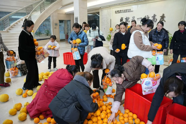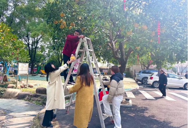 所以雙童組織女同胞們一起來采摘、分發(fā)!搭上梯子、帶上框子,一群人圍在柚子樹下期待著美味的果實(shí)。