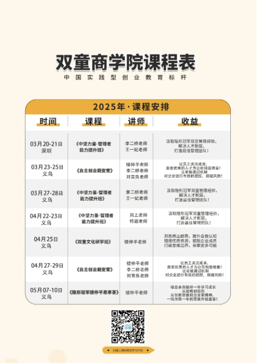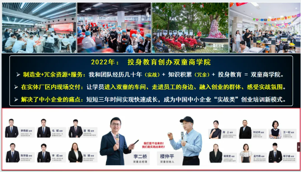然而,樓仲平并不滿足于此,他將目光投向了更廣闊的文化產(chǎn)業(yè)與教育領域。他創(chuàng)立雙童商學院,致力于培養(yǎng)具有全球視野、創(chuàng)新精神和實戰(zhàn)能力的企業(yè)家和高管人才的非營利性教育機構。