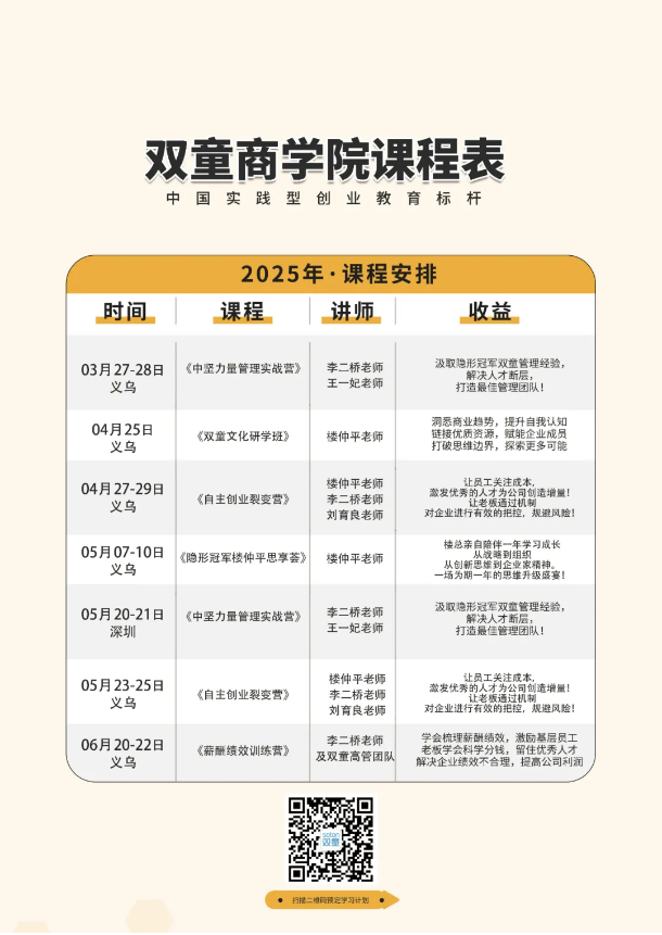 當(dāng)然,除了現(xiàn)場(chǎng)課堂,還有創(chuàng)始人樓仲平老師的主題課程分享,更有分享結(jié)束后,還將以問答互動(dòng)的形式為學(xué)員們解答參觀過程中疑惑、或者企業(yè)發(fā)展中遇到的問題,讓大家在研學(xué)活動(dòng)中避免走馬觀花,真正找到“雙童”經(jīng)營(yíng)過程中的科學(xué)管理邏輯,實(shí)現(xiàn)創(chuàng)業(yè)思維的升階!
