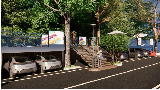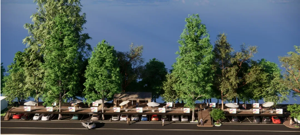 雙童的百米文化長(zhǎng)廊對(duì)面正是一片樹(shù)林和停車場(chǎng),只需要設(shè)計(jì)一個(gè)懸空走廊,既保住了原有的樹(shù)木,還留住了停車場(chǎng)地,又可以有一塊新的員工休閑區(qū),三全其美!