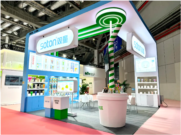 今年的展臺(tái)設(shè)計(jì)采用了雙童logo的主題色藍(lán)色作為主視覺色調(diào),并融入了現(xiàn)代流線型的設(shè)計(jì)風(fēng)格。綠白色的巨型吸管尤為醒目,設(shè)計(jì)元素中突顯了雙童產(chǎn)品的環(huán)保理念。