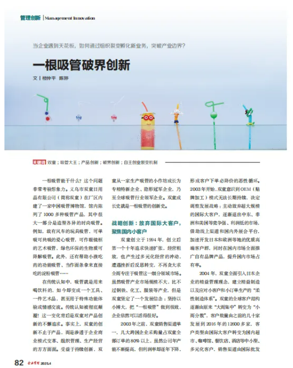 在傳統(tǒng)認知中,吸管就是用來喝飲料的,如今卻變成一個工具、一件藝術(shù)品,甚至用于特殊功能體驗或情感交流。傳統(tǒng)認知被徹底顛覆!這一變化背后是雙童對產(chǎn)品創(chuàng)新的不懈追求。事實上,雙童的創(chuàng)新不止于產(chǎn)品,而是滲透于企業(yè)商業(yè)模式變革、組織管理、生產(chǎn)經(jīng)營的方方面面。受益于持續(xù)創(chuàng)新,雙童從一家生產(chǎn)吸管的小作坊成長為專精特新企業(yè)、隱形冠軍企業(yè),乃至全球吸管行業(yè)領(lǐng)軍企業(yè)。雙童成長史就是一根吸管的創(chuàng)新史。