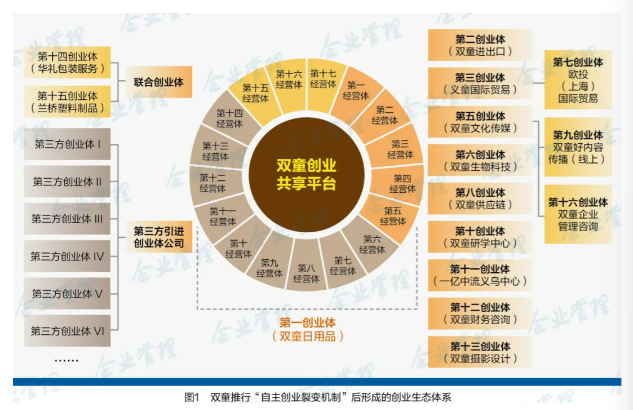 推行“自主創(chuàng)業(yè)裂變機制”五年來,雙童已孵化出16家創(chuàng)業(yè)體公司,形成以主業(yè)務板塊為核心的雙童創(chuàng)業(yè)生態(tài)(見圖1),40多位員工成為創(chuàng)業(yè)體公司股東,完成從“打工人”到“創(chuàng)業(yè)老板”的華麗轉(zhuǎn)身,實現(xiàn)企業(yè)與員工共同富裕。同時,雙童從一家實體制造企業(yè),轉(zhuǎn)型為工貿(mào)一體、孵化裂變的平臺型企業(yè)。由于新的創(chuàng)業(yè)體公司也可以通過拆分裂變出經(jīng)營體,目前雙童創(chuàng)業(yè)共享平臺已經(jīng)合計裂變出26個經(jīng)營體。