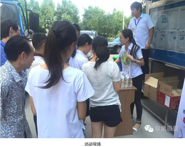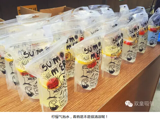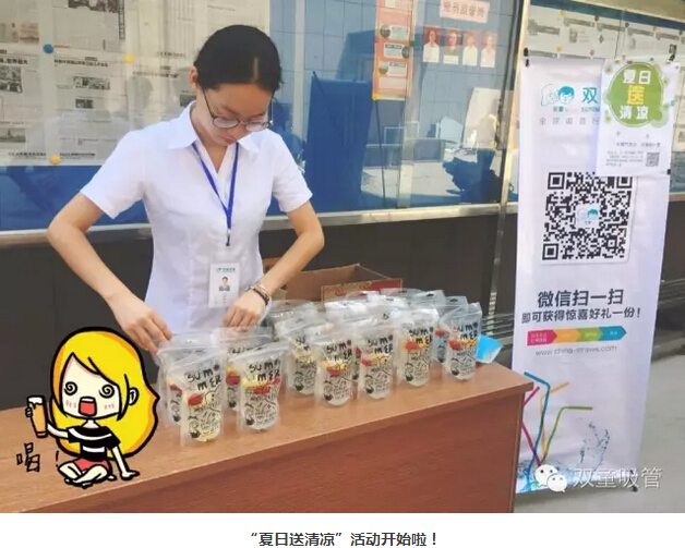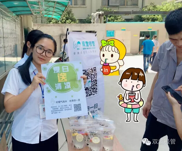 瞧!我們剛開張,就吸引了不少正要去吃飯的員工們。原來,拿到飲料的方法特別簡單,只需要關(guān)注“雙童吸管”的微信公眾平臺并轉(zhuǎn)發(fā)微信,即可獲得檸檬氣泡水一袋呢!看來吸管妞為了微信的推廣也是絞盡腦汁啦!