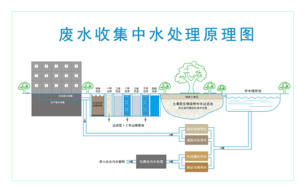 所謂“廢水收集處理循環(huán)回用系統(tǒng)”,就是將員工的生活廢水過濾后匯聚到“ 雙童一號樹”下進行生物吸附處理,形成中水,然后再流入景觀池下的中水儲存池中,以便供給廠區(qū)所有衛(wèi)生間的馬桶沖水、綠化噴淋和道路清洗、車輛清洗所用。