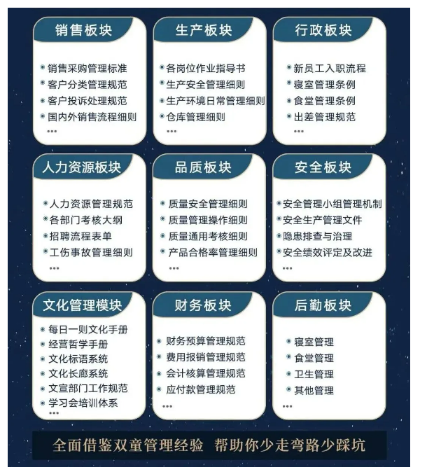 入學(xué)“隱形冠軍樓仲平思享薈”之后,你將獲得“雙童”積累了31年、包含了銷售、生產(chǎn)、行政、人力資源、品質(zhì)、安全、文化管理、財(cái)務(wù)和后勤等9大板塊,近600份管理規(guī)范文件,可以幫助企業(yè)全面借鑒雙童管理經(jīng)驗(yàn)、少走彎路、少踩坑!