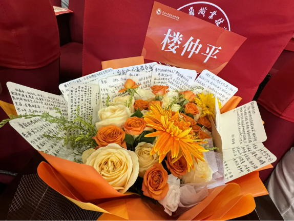 就在樓仲平老師飽含深情地發(fā)表寄語,還未走下講臺時,上演了一幕意外的溫馨畫面——學生代表手捧鮮花走上演講臺,將一束精心準備的花束送到了他手中。令人動容的是,花束中還夾雜著數百封來自學弟學妹們的感謝信,每一封信都寫滿了真摯的情感與感激之情。