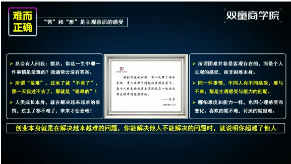 作為擁有47年創(chuàng)業(yè)史的創(chuàng)業(yè)老兵,樓仲平老師對(duì)于“苦難”始終有自己的觀點(diǎn):他認(rèn)為困難并非是客觀存在的,而是個(gè)人主觀的感受,而非困難本身。創(chuàng)業(yè)本身就是在解決越來越難的問題,你能解決他人不能解決的問題時(shí),就說明你超越了他人。