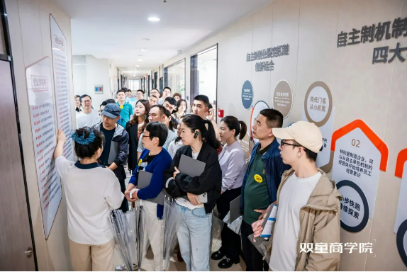 在游學過程中,講解員還會邀請到創(chuàng)業(yè)體總經理為大家一一介紹“雙童”自主創(chuàng)業(yè)裂變機制具體落地方式、以及各經營體是如何劃分、創(chuàng)業(yè)體是如何裂變出來、二者與母體公司的關系及選拔機制。