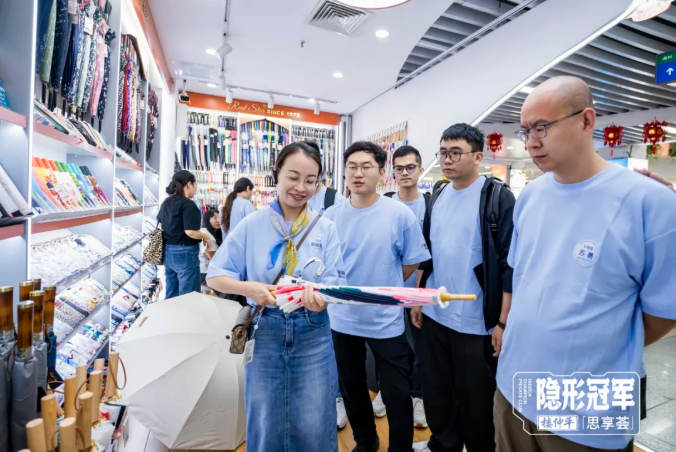 二區(qū)的商品定位是五金電子和家居用品專業(yè)市場,樓老師和同學們一起實地探訪了多家五金工具、家電和傘類的頭部商戶,特別是在一個上個央視新聞的傘業(yè)商位前,擺滿了無邊角設計的兒童傘、充滿復古風的國潮傘……商鋪負責人也曾說,“客戶來了,永遠都有新款,企業(yè)的生命在于與時俱進?!蹦壳霸摴疽褤碛?000多款雨傘,產(chǎn)品附加值持續(xù)提升,不斷進入中高端市場,如今已出口100多個國家和地區(qū)。